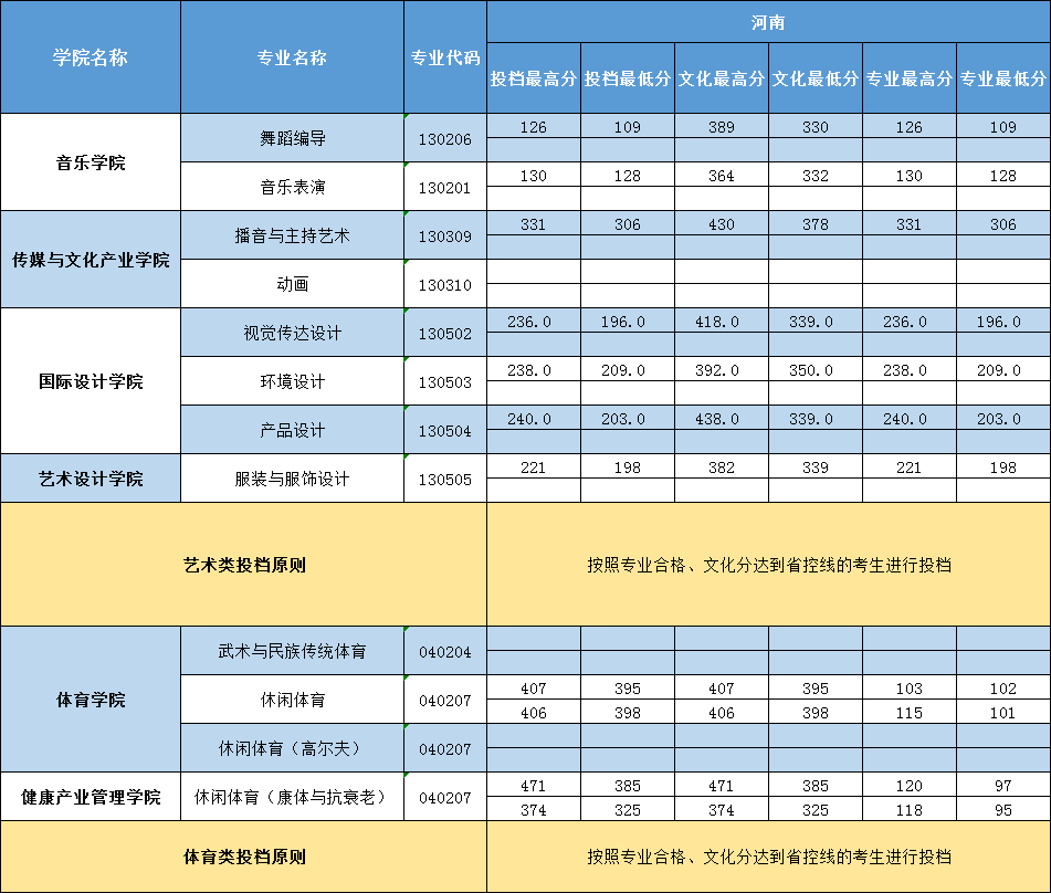 三亚学院2019年河南艺术体育类录取分数一览表