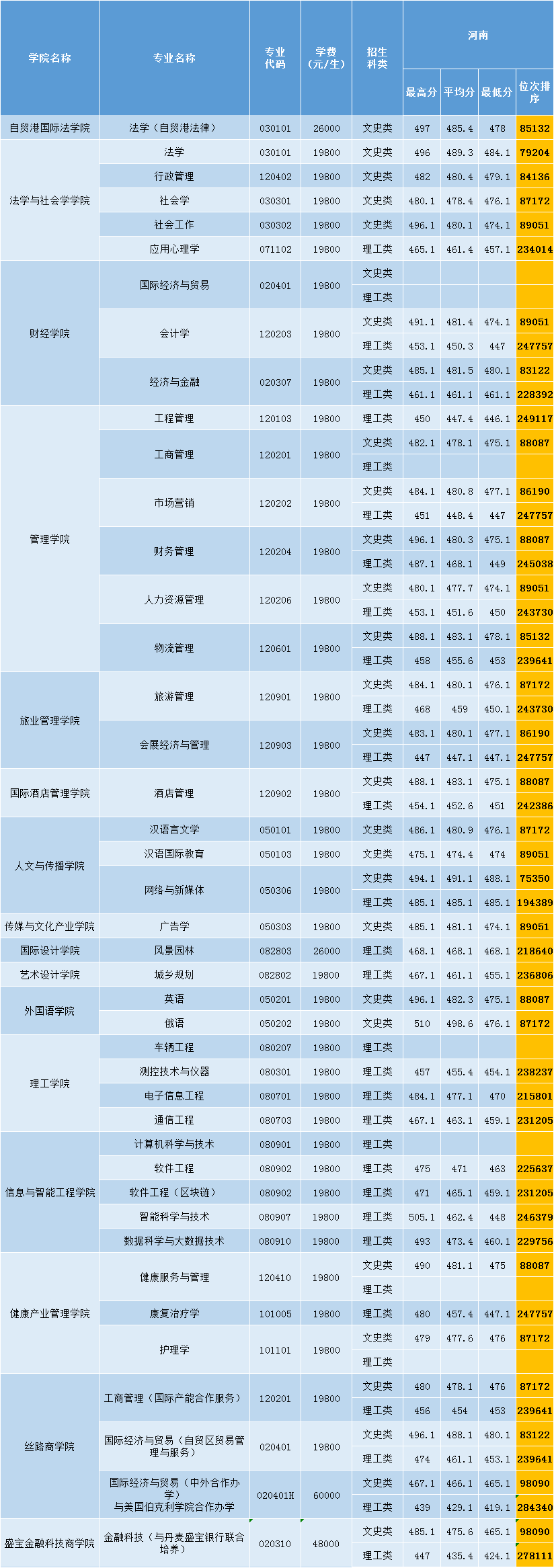 三亚学院2020年河南省普通类录取分数一览表