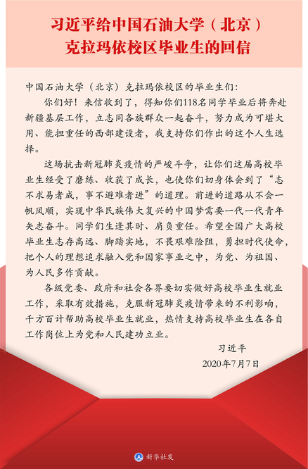 2020年6月,校区首届435名毕业生中,有118名学生选择留在新疆基层,在西部建功立业。2020年7月7日,中共中央总书记、国家主席、中央军委主席习近平给中国石油大学(北京)克拉玛依校区毕业生回信,肯定了他们到边疆基层工作的选择,对广大高校毕业生提出殷切期望。习近平总书记饱含深情的回信,迅速在全国高校以及社会各界引发热烈反响。总书记的回信不仅是对校区首届118名毕业生人生选择的充分肯定,也是对校区办学目标和办学四年来人才培养成果的充分认可。校区首届毕业生选择到西部就业,充分诠释了高等教育的政治责任和使命担当,面对边疆地区如何发展优质高等教育的重要课题,校区以实际行动向社会各界生动展示了中石大方案。