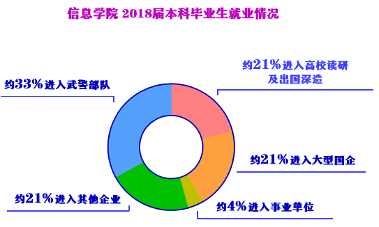 信息学院2019届本科毕业生总数260人,年终就业率为93.77%,本科毕业生已就业(含考研)244人,未就业16人,其中考取研究生(含保研)的有45人,出国深造的有3人,进入中国移动、中国电信、四大银行、电力系统、航空公司等大型国有企业的有79人,进入公务员及事业单位的8人,其他企业70多人,37名武警国防生进入全国各地武警部队。