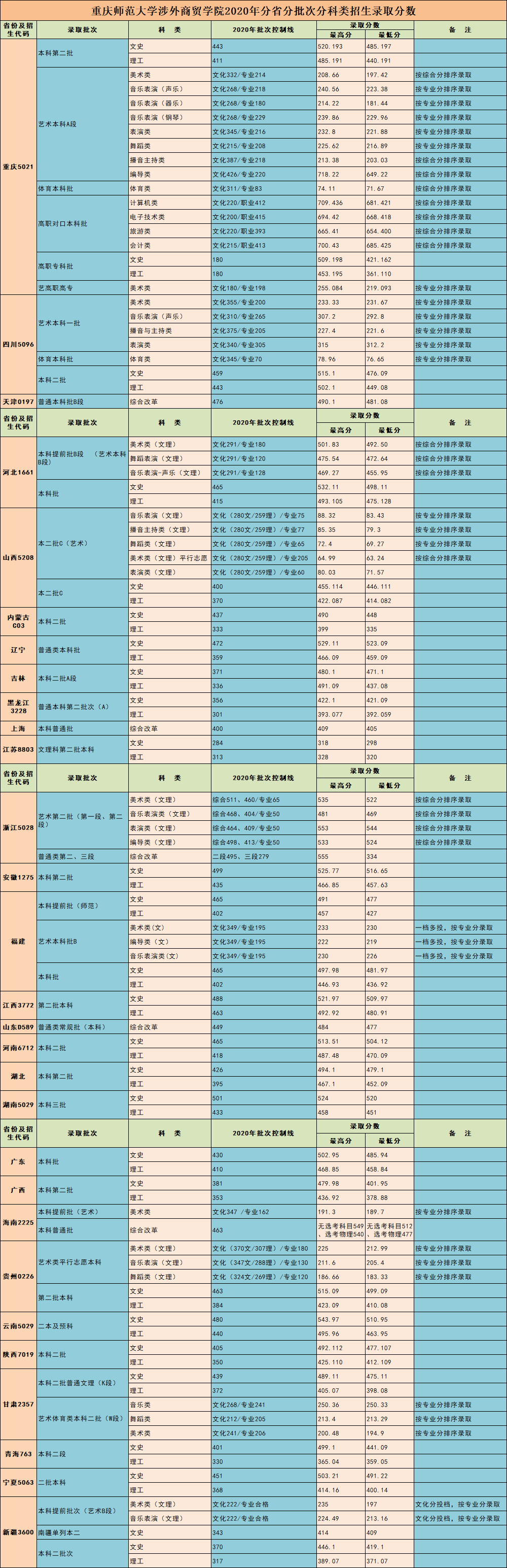 重庆对外经贸学院2020年分省分批次分科类录取分数