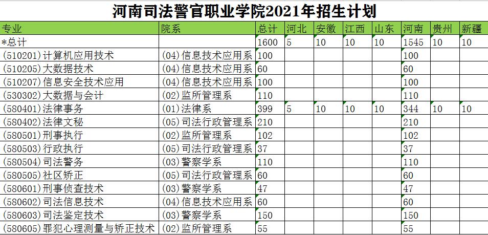 河南司法警官职业学院2021年招生计划