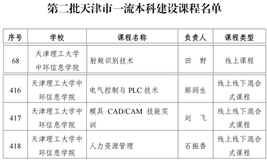 近日,天津市教委公布了第二批天津市一流本科建设课程名单,中环信息学院的《射频识别技术》《电气控制与PLC技术》《模具CAD/CAM技能实训》和《人力资源管理》4门课程入选。