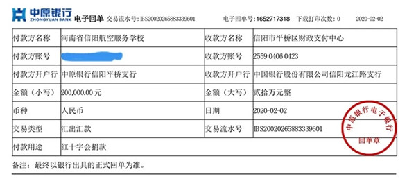 为支持信阳市区抗击疫情,打赢防控阻击战,2月初,信阳航空职业学院、信阳航空服务学校向平桥区红十字会捐款20万元。