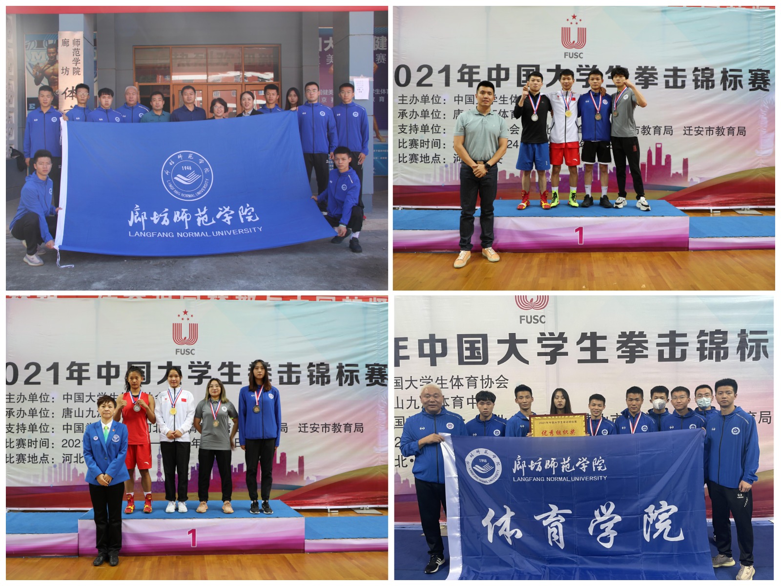 9月22至28日,由中国大学生体育协会举办的2021年中国大学生拳击锦标赛在河北迁安举行。经过一周激烈角逐,我校代表队荣获三枚铜牌、5个第五名的好成绩,并有两名同学荣获“优秀运动员”称号,我校代表队荣获“优秀组织奖”。