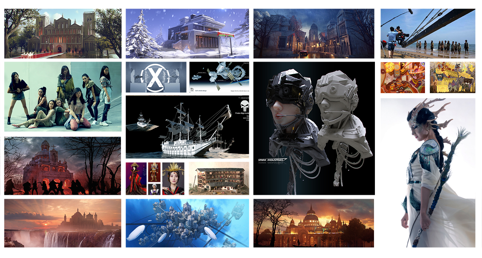 概念美术设计,影视道具设计,舞台美术设计、影视级模型制作、影视剪辑、影视调色、影视特效、栏目包装、影视人物造型设计、特效化妆、服装制作与展示等。