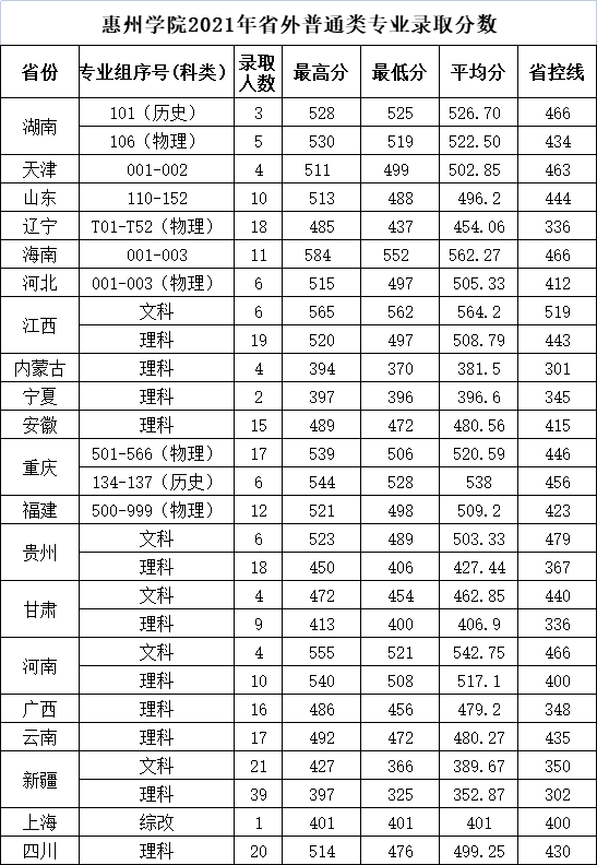 惠州学院2021年省外普通类专业录取分数