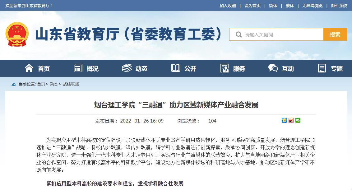 省教育厅刊发我校经验文章《烟台理工学院“三融通”助力区域新媒体产业融合发展》