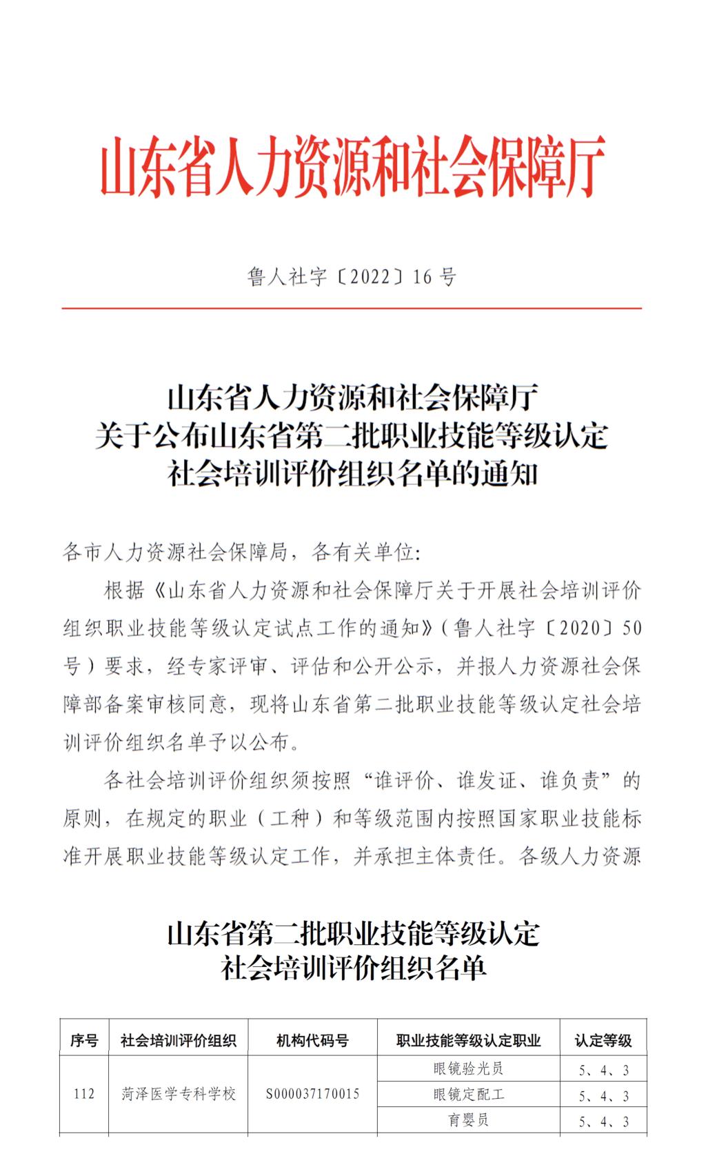 近日,山东省人力资源和社会保障厅发布《关于公布山东省第二批职业技能等级认定社会培训评价组织名单的通知》,我校成功获批山东省第二批社会培训评价组织,具备眼镜验光员、眼镜定配工、育婴员3个职业工种初、中、高级认定资格。