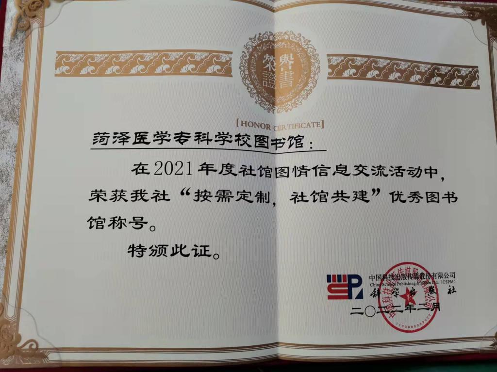 近日,我校图书馆荣获科学出版社2021年度“按需定制,社馆共建”优秀图书馆称号。