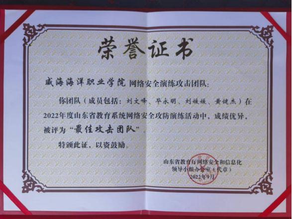 我院荣获2022年度山东省教育系统网络安全攻防演练 “最佳攻击团队”荣誉称号