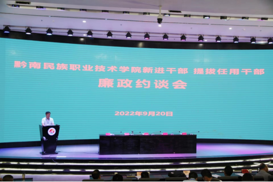 随后在知行楼学术报告厅召开新进干部及提拔任用干部廉政约谈会,党委班子成员出席会议,纪委书记胡成林主持会议。