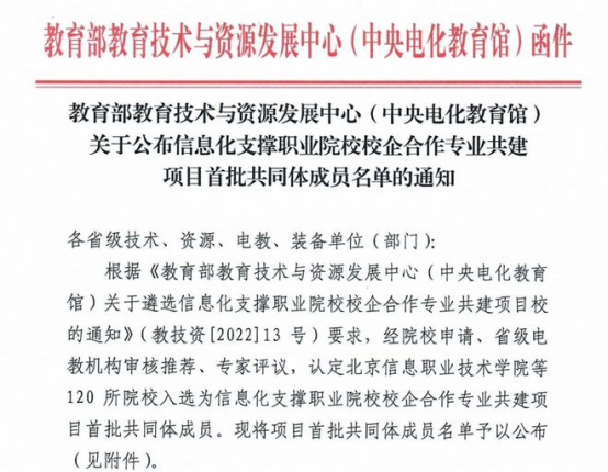 近日,教育部教育技术与资源发展中心(中央电化教育馆)下发了《关于公布信息化支撑职业院校校企合作专业共建项目首批共同体成员名单的通知》文件,我院成功入选该项目首批共同体成员名单。