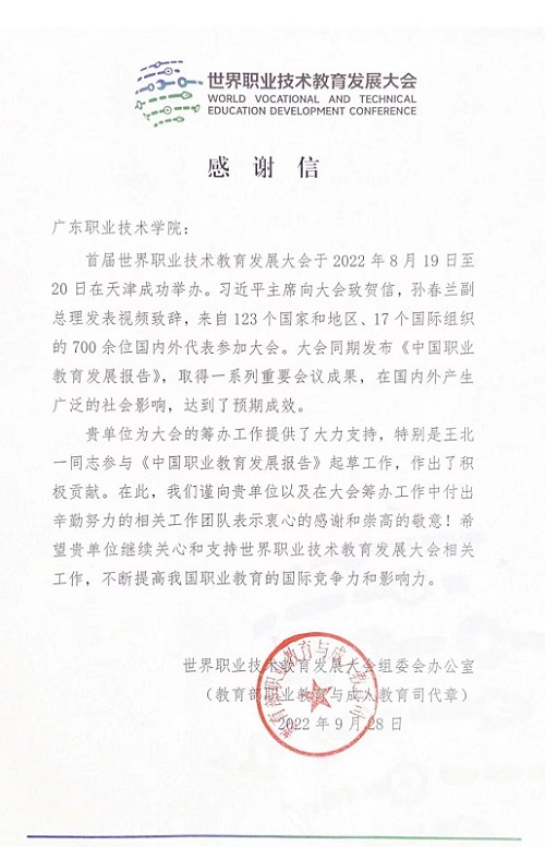 10月1日,学校收到世界职业技术教育发展大会组委会办公室发来的感谢信,感谢学校为首届世界职业技术教育发展大会筹办工作给予大力支持,充分肯定了学校的积极贡献。