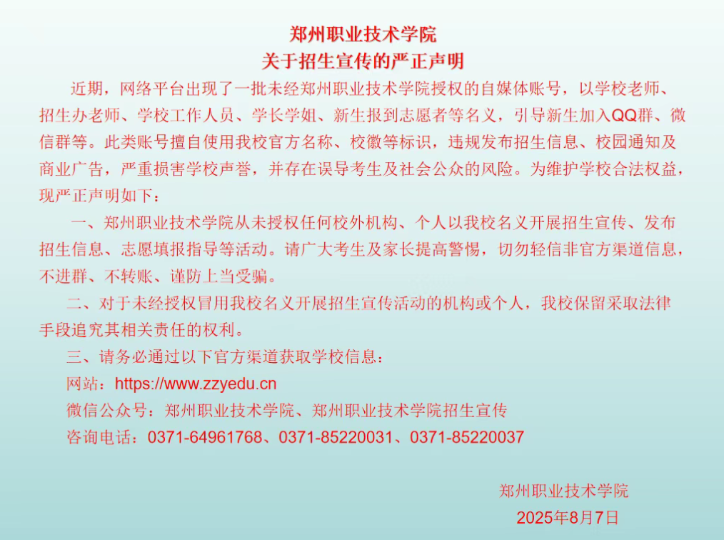 郑州职业技术学院关于招生宣传的严正声明