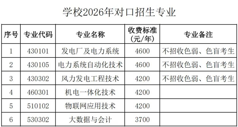 第十二条 我校招收考生体检按《普通高等学校招生体检工作指导意见》及相关补充规定执行。发电厂及电力系统、电力系统自动化技术、风力发电工程技术专业不适宜辨色能力异常(色盲、色弱)考生攻读,不招收色弱、色盲考生。