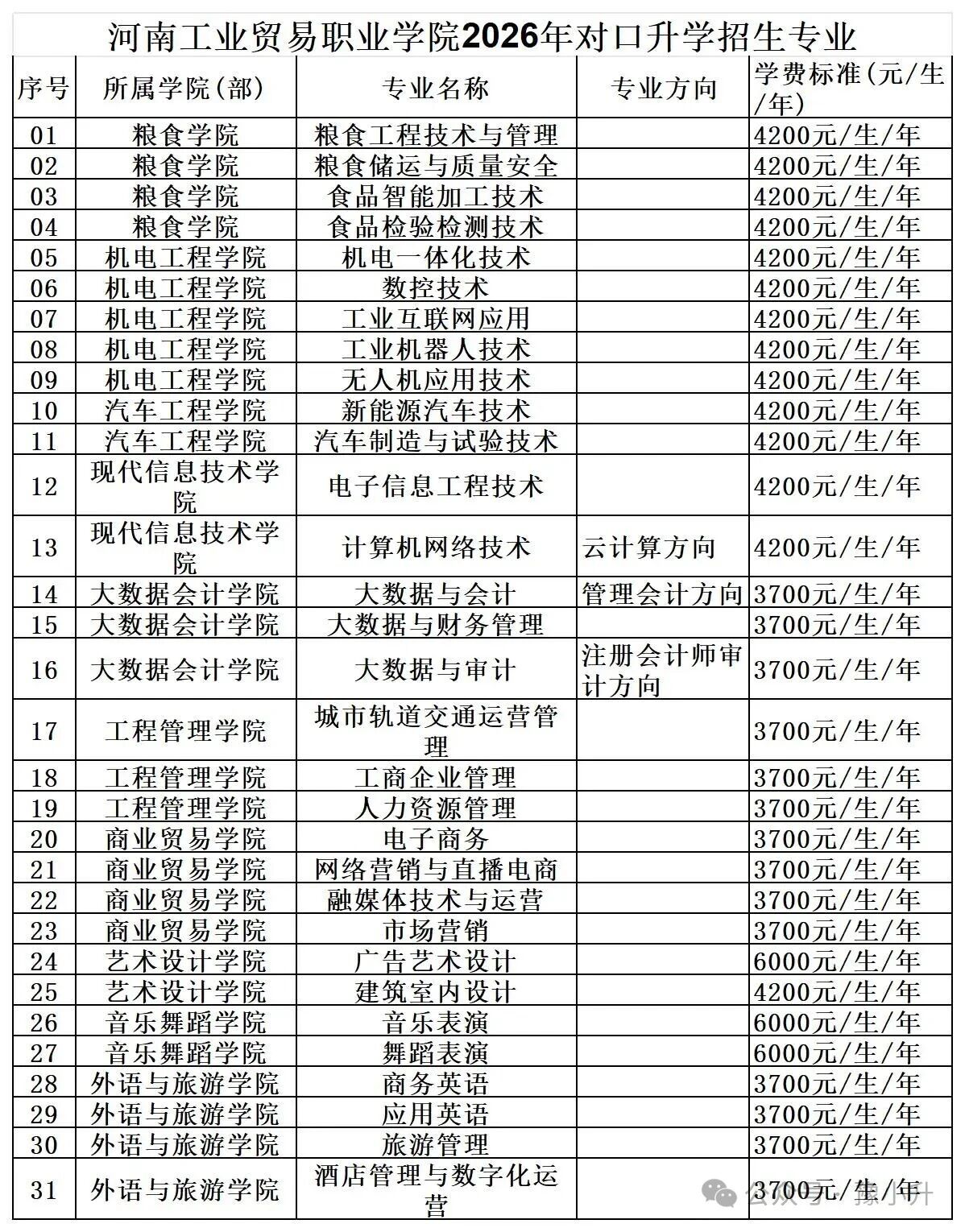 1.2026年学费标准按照《河南省发改委、河南省财政厅、河南省教育厅关于调整公办普通高校学费标准的通知》(豫发改〔2020〕456号)和政府收费主管部门有关规定执行,理工类4200元/生·年,文科类3700元/生·年,艺术类6000元/生·年,详见《河南工业贸易职业学院2026年对口招生专业汇总表》(附后)。