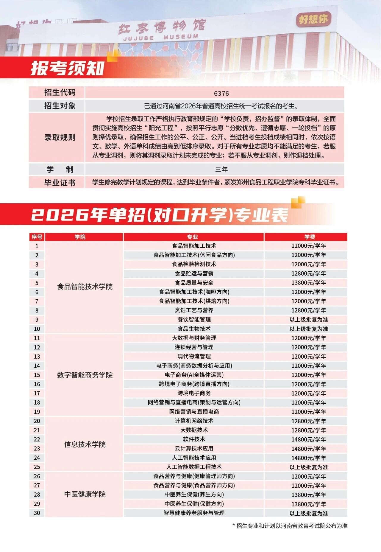 郑州食品工程职业学院2026单招(对口)招生简章