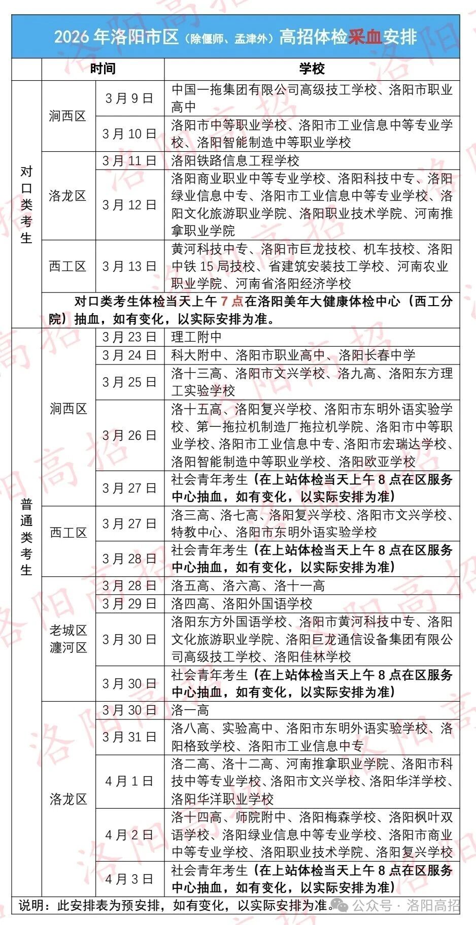3月3日下午,洛阳市教育考试中心召开2026年普通高校招生体检工作会议,对高招体检进行安排,市区(除偃师、孟津外)考生将于3月9日至4月10日体检。