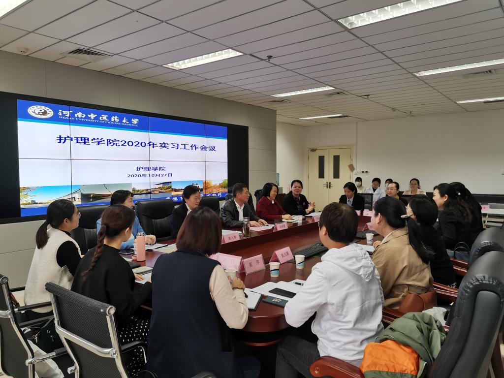 2020年10月27日下午,护理学院在实训楼1015会议室召开实习工作会议,护理学院领导、专业负责人、教研室负责人、辅导员、教学督导人员和我校第一、二、三、五附属医院、郑州大学第一附属医院、河南省人民医院、阜外华中心血管病医院、洛阳正骨医院(郑州院区)、河南省直第三人民医院、郑州颐和医院、解放军第988联勤部队医院等单位的护理实习负责人参加了会议。会议由护理学院副院长秦元梅主持。
