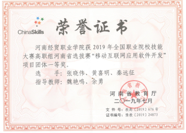 2016年至2019年,多次参加全国职业院校技能大赛“移动互联网应用软件开发”赛项,获得国赛一等奖1次、国赛三等奖1次、省赛一等奖2次、省赛二等奖1次。