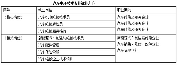 本专业培养德、智、体、美全面发展,具有良好的综合素质,掌握汽车电气、电控系统的构造、工作原理、维修和故障诊断的基本知识,掌握电子产品工作原理、性能检测、生产与销售的基本知识。具有汽车机电维修,汽车电子产品的安装、调试、检测、维修等技术服务能力;具有汽车电子产品研制、检测与鉴定技术能力。可从事汽车机电维修、汽车电子产品的辅助性研发工作,也可从事汽车电子产品生产企业的生产管理、质量管理和产品销售等工作的高素质技能型应用人才。