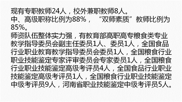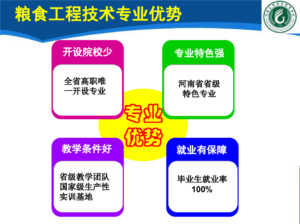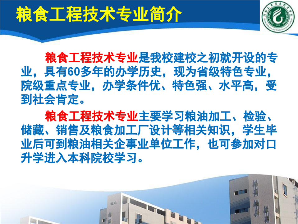 粮食类专业是河南工业贸易职业学院的传统优势专业, 已有60多年的办学历史,是我院品牌特色专业。学院前身河南省粮食学校即开设有粮油储检专业, 并承担着全省粮食行业人才培养和干部培训的任务。