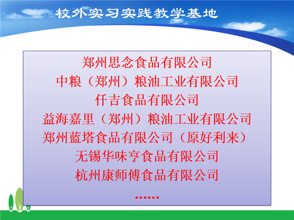 该专业建设有高标准的粮油储藏及检测方面的实验实训室,有多个校外实训基地,为提高学生的实践能力奠定了坚实的基础。
