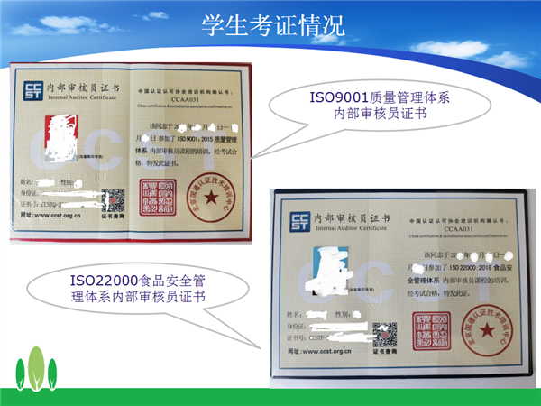 我院是粮食行业特有工种职业技能鉴定站,本专业拥有多名国家级考评员,学生在校期间即可参加全国统一考试鉴定,考试合格可获取高级粮油保管员、高级粮油质量检验员职业资格证书,保证学生毕业时即可获得双证书(毕业证书和职业资格证书),使学生毕业时即具备熟练的操作技能,就业后可以在较短的时间内适应工作。
