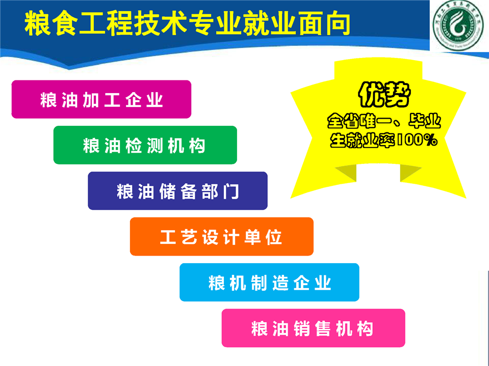 就业方向:面向中央储备粮直属库、国家粮油储备库、中粮集团、益海嘉里等省内外各级粮油仓储企业、粮油加工企业、粮油食品质检机构等,从事粮油保管、技术管理、粮油食品检化验、仓储物流等工作。