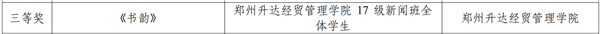 本网讯 近日,河南省教育厅公布了2020年中华经典诵写讲大赛的评选结果,郑州升达经贸管理学院文法学院教师王歌的作品《歌颂祖国》荣获大赛教师组“三等奖”;该校17级新闻班全体学生作品《书韵》荣获大赛学生组“三等奖”。