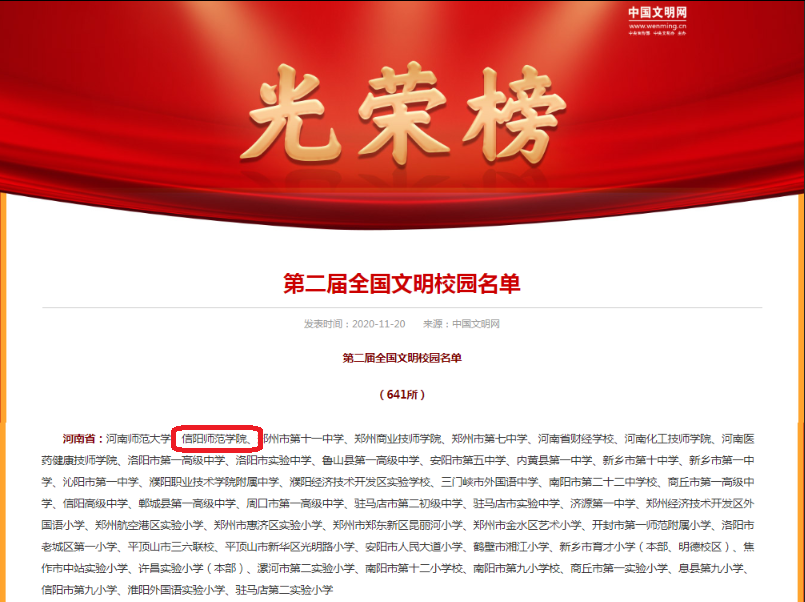 第二届全国文明校园评选由中央文明办会同教育部对照文明校园“六个好”的创建标准严格审核、优中选优,经过自愿申报、复查审核、遴选公示等多个环节,全国共有50所高校入选。全国文明校园是学校精神文明建设领域的最高荣誉,此次获选,是我校继2009年、2011年、2015年、2017年连续四届荣获全国文明单位后,在精神文明创建领域取得的又一殊荣。