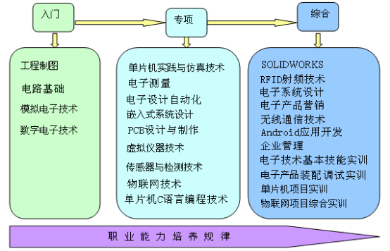 专业技能课程模块分为专业基础课程、专业能力课程和专业拓展课程。其中专业基础课程是学生适应电子信息技术职业领域应具备的专业基础知识和基本技能课程;专业技能课程是直接针对职业岗位和专业培养目标开设的课程;专业拓展课程是拓展学生专业知识面,培养学生的专业素质和综合能力的课程。
