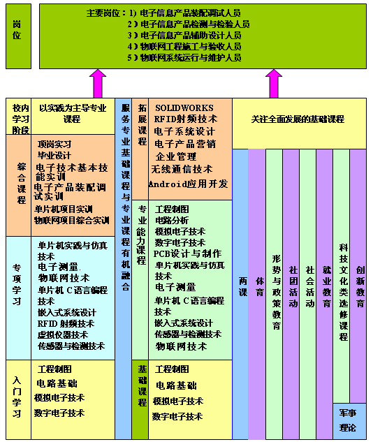 本专业培养面向电子信息行业、物联网技术领域、企事业单位,拥护党的基本路线,德、智、体、美等方面全面发展,具有良好的职业素质、文化修养与创新精神,掌握电子信息技术及物联网技术的相关知识,具有信息产品的设计、检测、通信、管理等能力,能从事智能家居、智能安防监控、智能电子布展、无线传感网、RFID射频系统等工程施工、安装、调试、维修等工作的专业技能型高素质技能型人才。