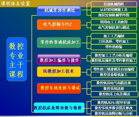 数控技术专业开设的主干课程有:机械零部件测绘与、电气控制与PLC、零件的普通机床加工、数控加工编程与操作、UG数控加工技术、数控系统连接与调试、数控机床故障诊断与维修等。