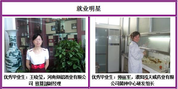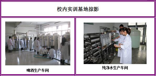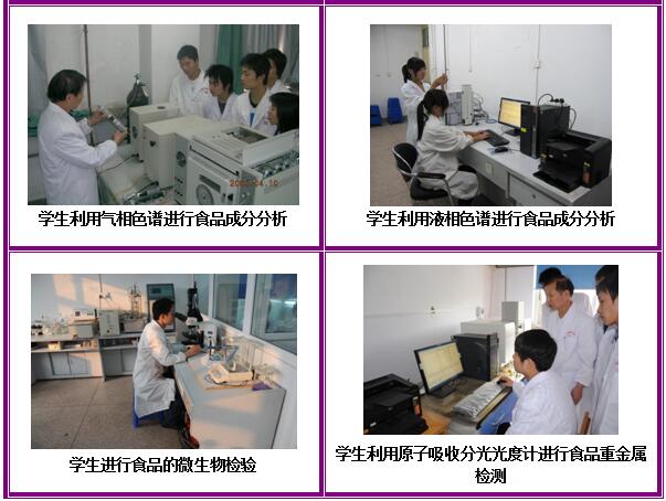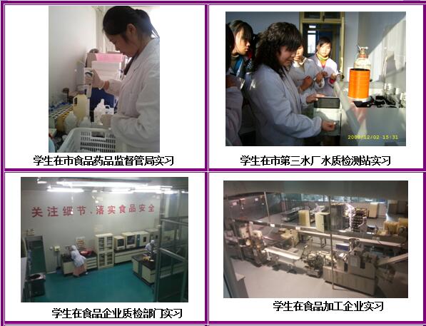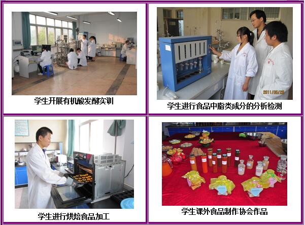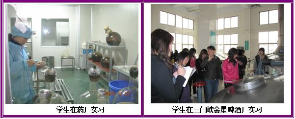 实训条件:建设有河南省高校工程技术研究中心1个、河南省示范性实训基地1个、三门峡市重点实验室1个;配备有总投资近600万,含纯净水生产线、啤酒生产线等生产线,以及好氧发酵系统、气相色谱、高效液相色谱、原子吸收等大型精密仪器的专业实训基地和创业人才培养基地。同时,与市食品药品监督管理局、市质量技术监督局、市出入境检验检疫局、雨润、思念、仰韶酒业、喜之郎、娃哈哈等多家知名企事业单位合作,建立校外实训基地。