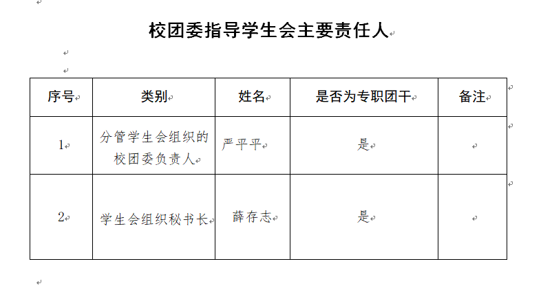 15、明确1名校团委专职副书记指导权级学生会组织;聘任校团委专职副书记或干部担任校级学生会组织秘书长。