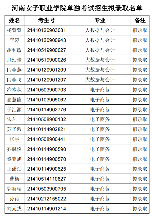 2021年河南女子职业学院单独考试招生 拟录取名单公示