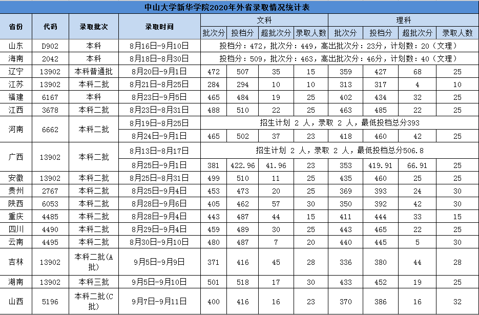 广州新华学院2020年招生录取分数统计表(其他省份)