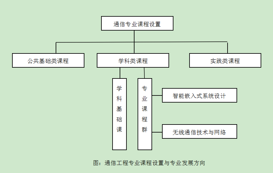 主修课程:除公共课外,本专业还设有学科基础课(通信工程专业导论、电路系列课程、高频电子线路、信号与系统、电磁场与电磁波、Python语言程序设计等)和专业课(通信原理、数字信号处理、DSP原理及应用、Matlab实验与仿真、移动终端应用开发),为适应智能化发展趋势,本专业新增多门专业选修课程(嵌入式系统原理及应用、电子线路与PCB设计、人工智能与机器学习、移动通信网(5G)、FPGA原理与应用、数据通信与计算机网络、无线通信技术等)。本专业还设置了电工电子实践初步、模拟电子线路、数字逻辑电路、电子课程设计、通信工程综合课程设计、生产实习等系列实验实践类课程。本专业课程设置与专业发展方向如下图所示。