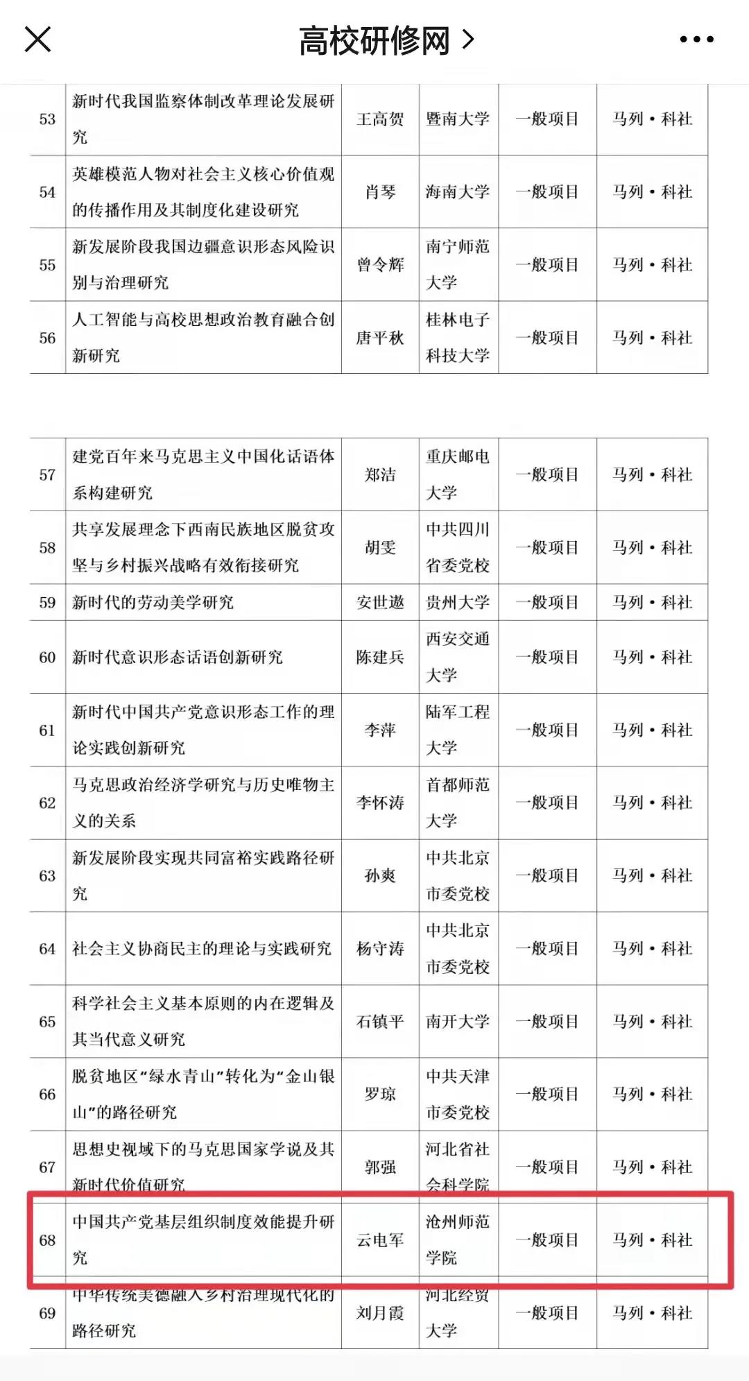 近日,全国哲学社会科学办公室对2021年国家社科基金年度项目和青年项目立项名单进行公示,沧州师范学院云电军主持的《中国共产党基层组织制度效能提升研究》喜登荣榜,这是沧州师范学院首次斩获马列社科类国家社科基金项目。本年度国家社科基金马列社科类立项224项,河北省有6项入选,中共河北省委党校2项,河北大学、河北师大、河北省社会科学院、河北经贸大学和沧州师范学院各1项。此次立项标志着我校科研整体水平迈上了一个新的台阶,表明我校科研工作在关键性指标跻身同类高校前列。我校作为此次立项的唯一一所河北省市属高校,开创了我省市属高校在马列社科类国家社科基金立项的先河,实现了我省市属高校科学研究工作的重大突破。
