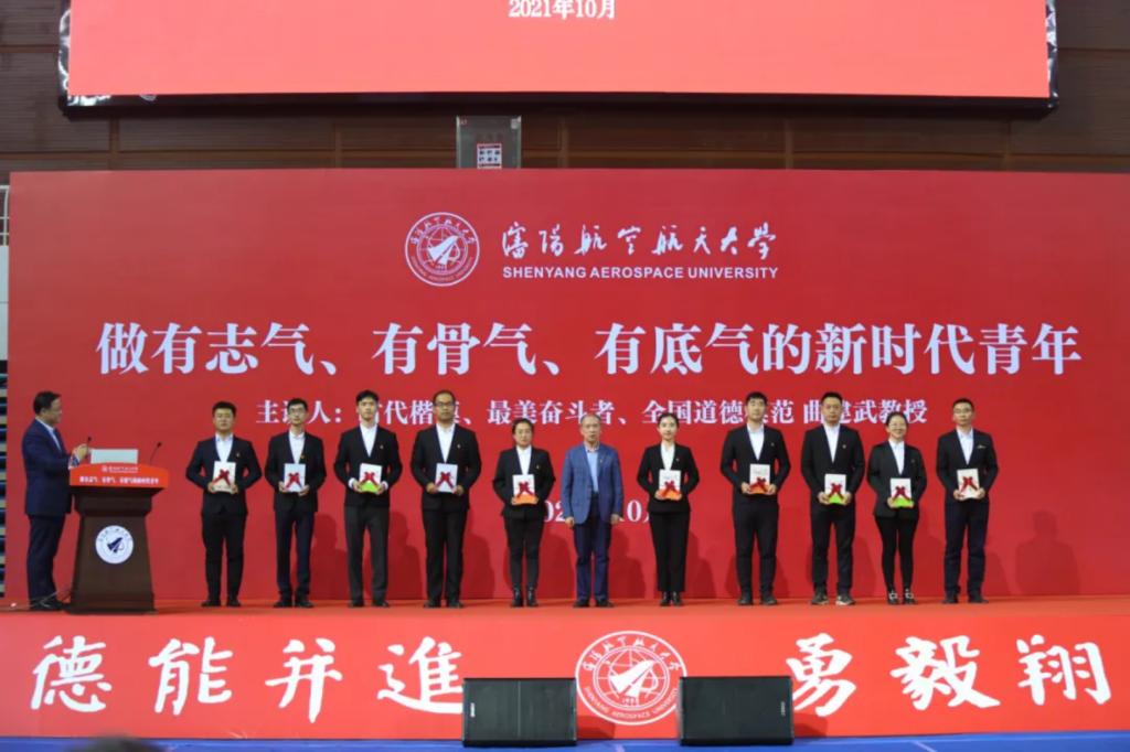 基金颁发仪式上,曲建武教授为我校5名“励志”大学生颁发全国“时代楷模”曲建武励志基金。