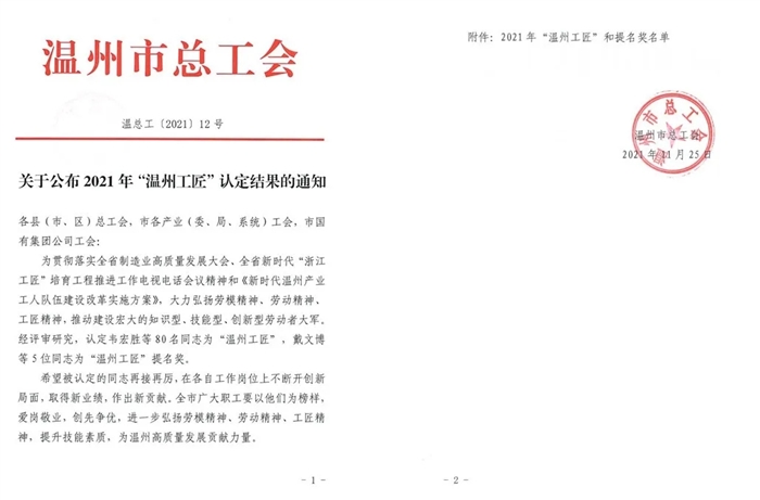 据悉,“温州工匠”评选活动每年举办一次,旨在大力弘扬劳模精神、劳动精神、工匠精神,推动建设宏大的知识型、技能型、创新型劳动者大军,以严谨细致、精益求精、创造极致的职业精神为温州高水平、高质量发展贡献力量。