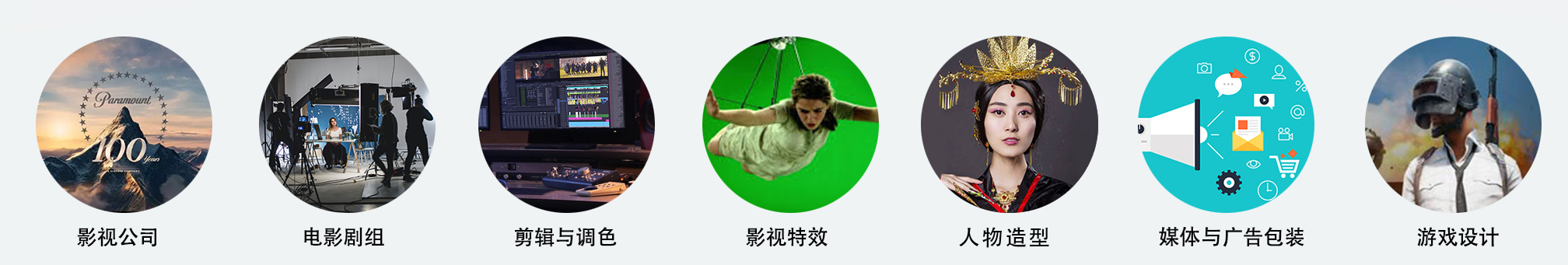 概念美术设计,影视道具设计,舞台美术设计、影视级模型制作、影视剪辑、影视调色、影视特效、栏目包装、影视人物造型设计、特效化妆、服装制作与展示等。