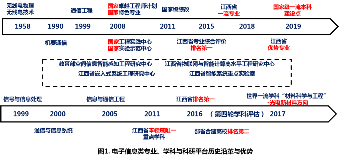 南昌大学电子信息类专业包括电子信息工程和通信工程两个本科专业。本专业源自1958年建校江西大学和江西工学院首批专业。近年来通信工程专业主持了国家级特色专业、国家一流本专业和国家级卓越工程师培养计划等近10余项教育部和江西省本科质量工程项目;电子信息工程专业入选国家级专业综合改革试点。信息与通信工程学科第四轮学科评估全省第一,部省合建高校第二,2017年入选世界一流建设学科“材料科学与工程”光电新材料方向。近十年先后组建教育部工程研究中心和4个省级工程中心或重点实验室,支撑了学科和专业发展,具体历史沿革如图所示。