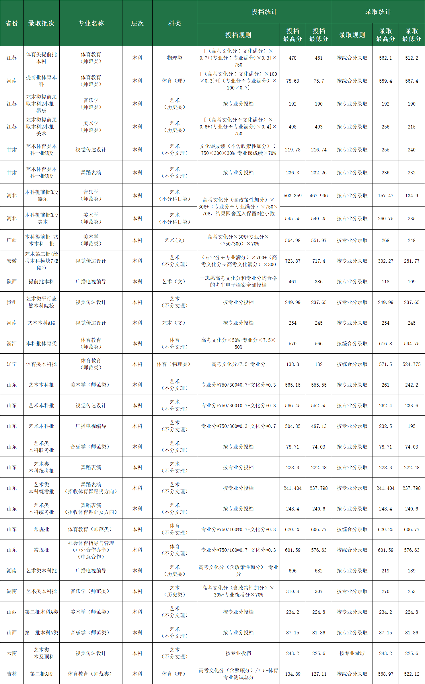 鲁东大学2021年艺术体育类专业投档及录取统计
