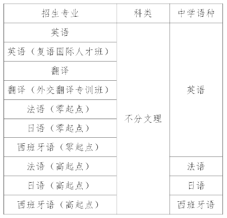 第六条 经教育部批准具有推荐保送生资格的外国语中学中具备外语类保送生资格,符合当年高考报名条件,身心健康,品学兼优,德智体美劳全面发展,有志于从事外交外事、翻译、国际问题研究、涉外法律、经济、文化交流和国际传播工作的应届高中毕业生。