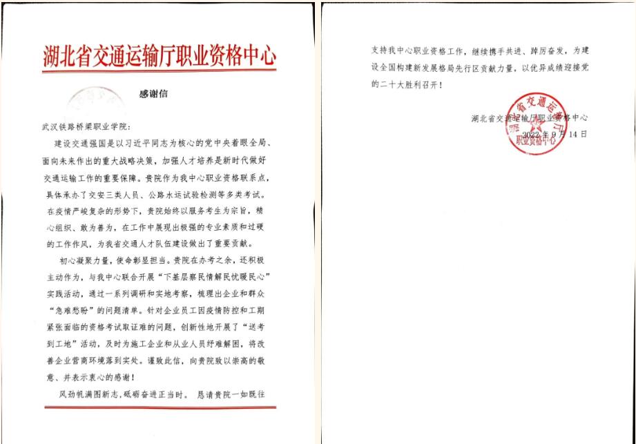 初心凝聚力量,使命彰显担当。贵院在办考之余,还积极主动作为,与我中心联合开展“下基层察民情解民忧暖民心”实践活动,通过一系列调研和实地考察,梳理出企业和群众“急难愁盼”的问题清单。针对企业员工因疫情防控和工期紧张面临的资格考试取证难的问题,创新性地开展了“送考到工地”活动,及时为施工企业和从业人员纾难解困,将改善企业营商环境落到实处。谨致此信,向贵院致以崇高的敬意、并表示衷心的感谢!