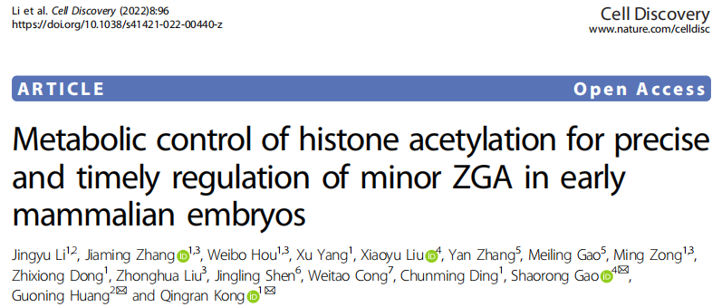 近日,我校附属妇女儿童医院生殖医学中心研究部(人类胚胎工程重庆市重点实验室)副主任李竞宇团队联合温州医科大学孔庆然团队和同济大学高绍荣团队,在国际著名学术期刊Cell Discovery上合作发表了题为“Metabolic control of histone acetylation for precise and timely regulation of minor ZGA in early mammalian embryos”的研究论文。该研究绘制了小鼠植入前胚胎全时期代谢动态图谱,通过结合表观组与转录组揭示了小鼠胚胎ZGA发生过程中代谢调控机制,有助于进一步理解代谢对哺乳动物胚胎发育的调控机制。
