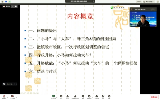 暨南大学颜昌武教授以“经济发达镇的治理之道”为题分享了他的研究成果。他以S市A镇为例,发展了一个解释性框架来回答“小马拉大车”的问题,即经济发达镇是如何在现有法定体制刚性约束下重新配置和整合治理资源,从而承载着繁重的规模负荷的。